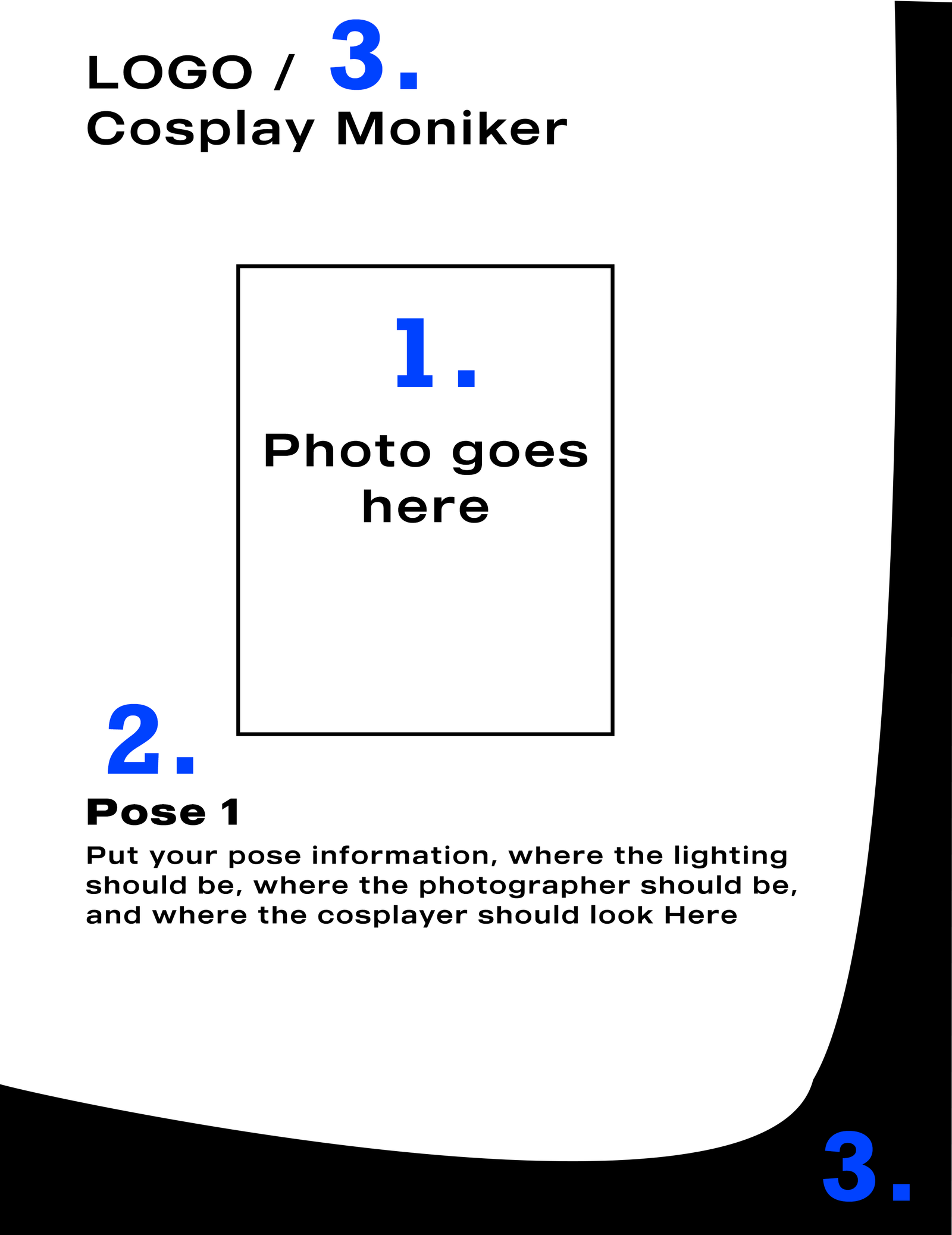 2. Put any notes here. Translate the pose into words. explain how the cosplayer should be standing. Photographers want to put in lens and lighting info in as well. If you plan on creating a composite, this can also be where you put in notes of what extras you will need for compositing, so you can match the lighting.